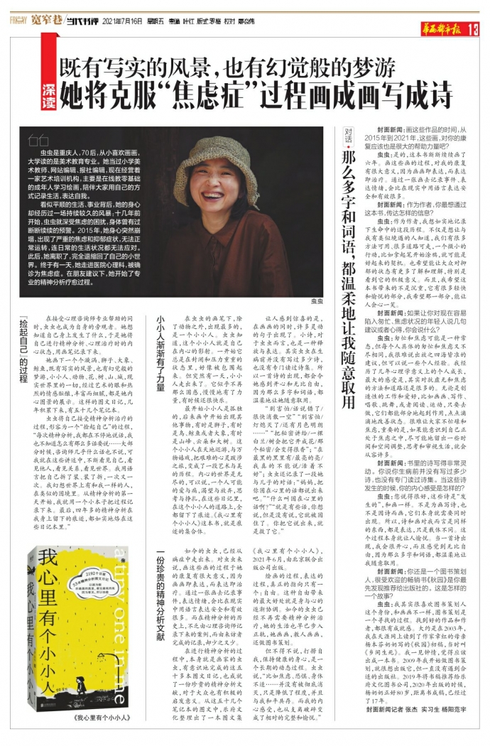 在进行精神分析的过程中,本身就是画家的虫虫,有意识地完成的这五十多本图文日记,也成就了一份珍贵的精神分析文献,对于大众也有积极的启发意义。从这五十几个笔记本的图文中,乐府文化整理出了一本图文集《我心里有个小小人》,2021年6月,由北京联合出版公司出版。