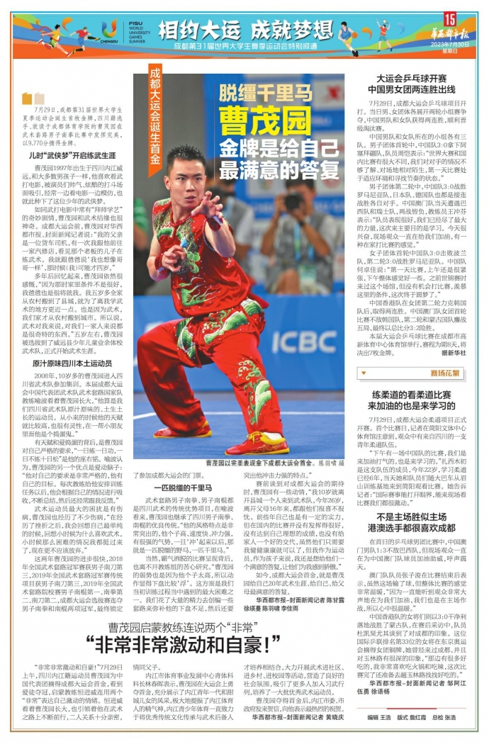 7月29日,成都第31届世界大学生夏季运动会诞生首枚金牌,四川籍选手、就读于成都体育学院的曹茂园在武术套路男子南拳比赛中发挥完美,以9.770分摘得金牌。