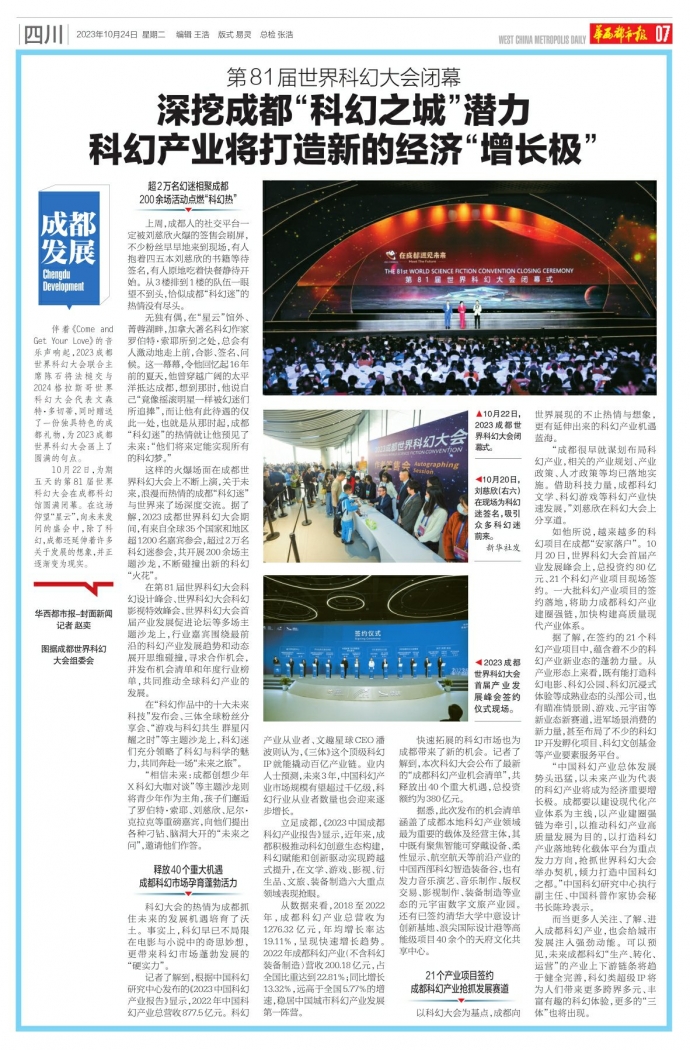 10月22日,为期五天的第81届世界科幻大会在成都科幻馆圆满闭幕。在这场仰望“星云”,向未来发问的盛会中,除了科幻,成都还延伸着许多关于发展的想象,并正逐渐变为现实。