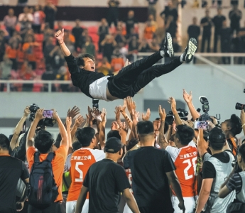 2018年,武汉卓尔冲超成功,球员赛后将主教练李铁抛起庆祝。新华社资料图片
