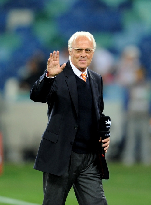 2010年7月7日,在南非德班举行的2010年足球世界杯德国队对阵西班牙队的半决赛前,贝肯鲍尔接受电视台采访时和友人打招呼。 新华社发