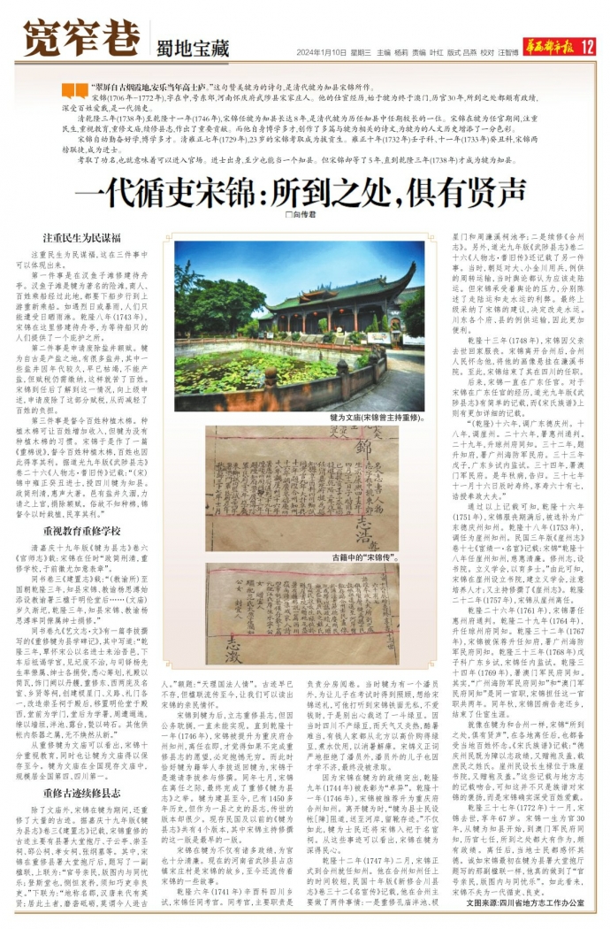 清嘉庆十九年版《犍为县志》卷六《官师志》载:宋锦在任时“政简刑清,重修学校,于前徽尤加意表章”。