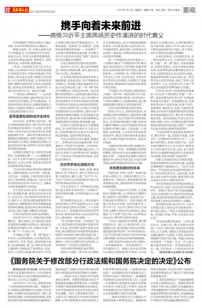 “历史是勇敢者创造的。让我们拿出信心、采取行动,携手向着未来前进!”习近平主席在瑞士发出的声音穿越时空,久久回响,为解决人类面临的共同问题贡献勇气与智慧,为变乱交织的世界凝聚共同前行的力量。构建人类命运共同体是一个需要一代又一代人接力跑才能实现的目标。中国将同国际社会一道,共同奔赴一个更加美好的未来。 (新华社瑞士达沃斯1月18日电)