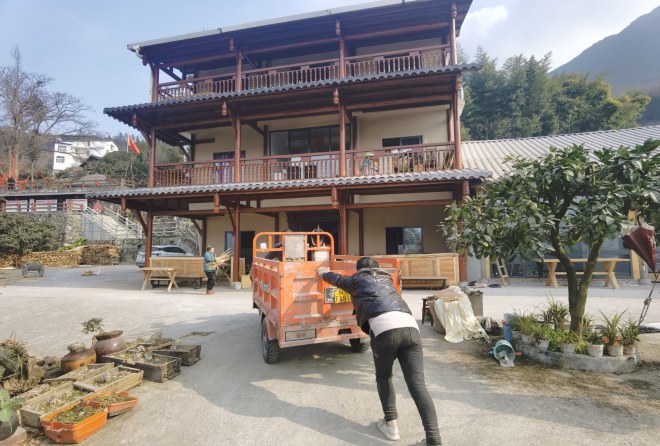 1月18日,石椅村“花果山庄”民宿前,女主人黄彦正戴着线手套,帮丈夫推动三轮摩托车,他们要把院子里散放的木材收集起来装车。“花果山庄”,正是石椅村7家进行升级改造的民宿之一。经营民宿,黄彦经验丰富,原本她经营11年的老“花果山庄”,就在新“花果山庄”的背后。