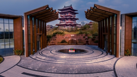 成都世园会主会场招商展示中心,远处即为散花楼。成都东部新区供图