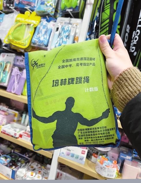 在重庆,记者以家长身份走访主城区多家中学周边文具店,问及是否售卖“中考跳绳”时,多名店主不约而同向记者推荐同一品牌——培林牌跳绳。