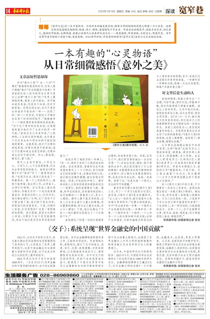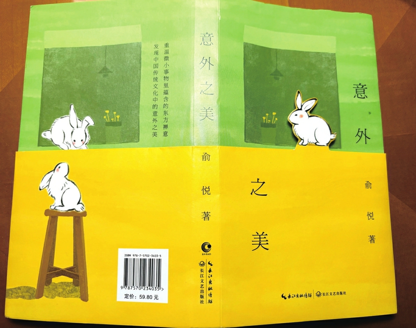 《意外之美》是一本可爱的书。它的开本风格是瘦长的,橙黄与草绿相间的封面上蹲着一只小白兔。这跟它的内容篇幅是相称的:轻盈、短小、精炼,每篇随笔千字左右。作者在这些随笔中,说故乡谈艺术,回忆亲人,感悟时节轮换,也聊阅读、收藏以及现代人的各种生活方式……视角独特,举重若轻,点到为止,智慧尽显。书中还有作者手绘的小画数十幅,更添意趣。2024新年伊始,作家俞悦的新书《意外之美》由长江文艺出版社出版。