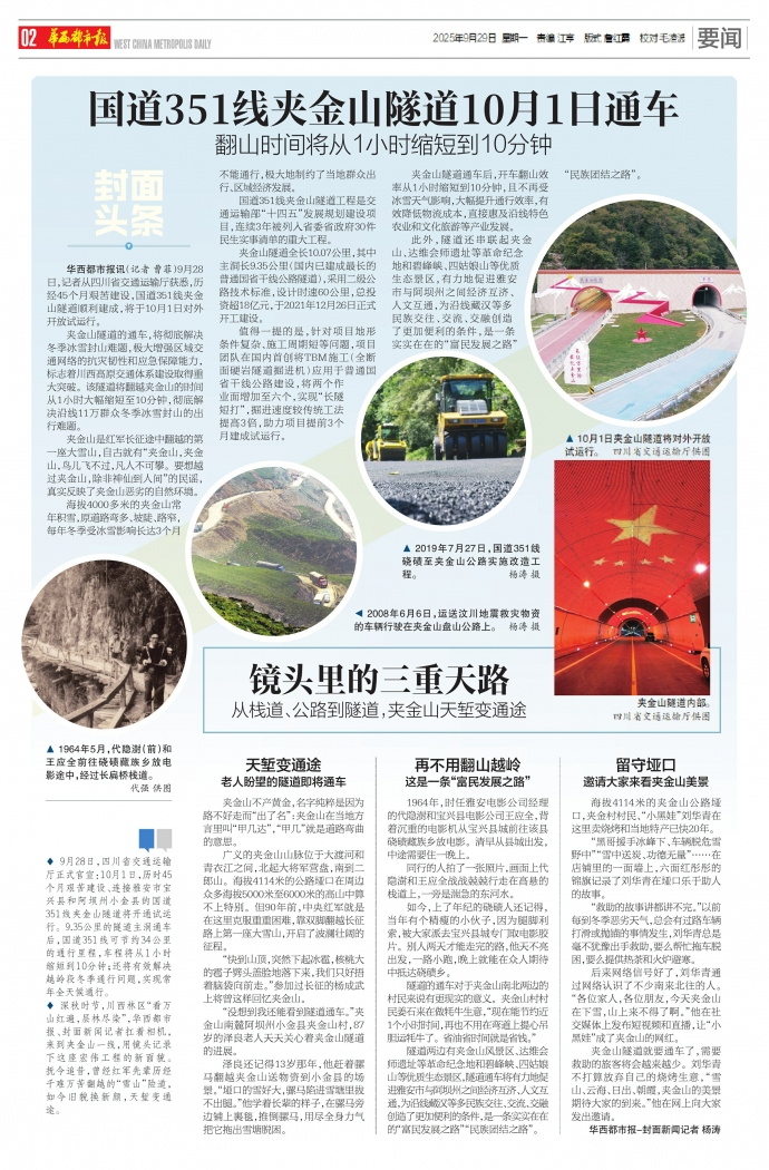 ♦ 9月28日,四川省交通运输厅正式官宣:10月1日,历时45个月艰苦建设、连接雅安市宝兴县和阿坝州小金县的国道351线夹金山隧道将开通试运行。9.35公里的隧道主洞通车后,国道351线可节约34公里的通行里程,车程将从1小时缩短到10分钟;还将有效解决越岭段冬季通行问题,实现常年全天候通行。