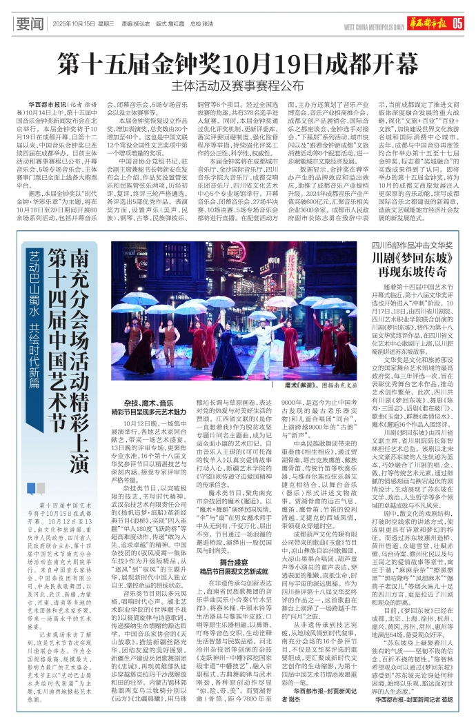 文华奖是文化和旅游部设立的国家舞台艺术领域的最高政府奖,每三年评选一次,旨在表彰优秀舞台艺术作品,推动艺术创作繁荣。此次,四川共有川剧《梦回东坡》、舞剧《陈寿·三国志》、话剧《谁在敲门》、歌曲《玉盘》、群舞《柔情似水》、魔术《邂逅》6个作品入围终评。