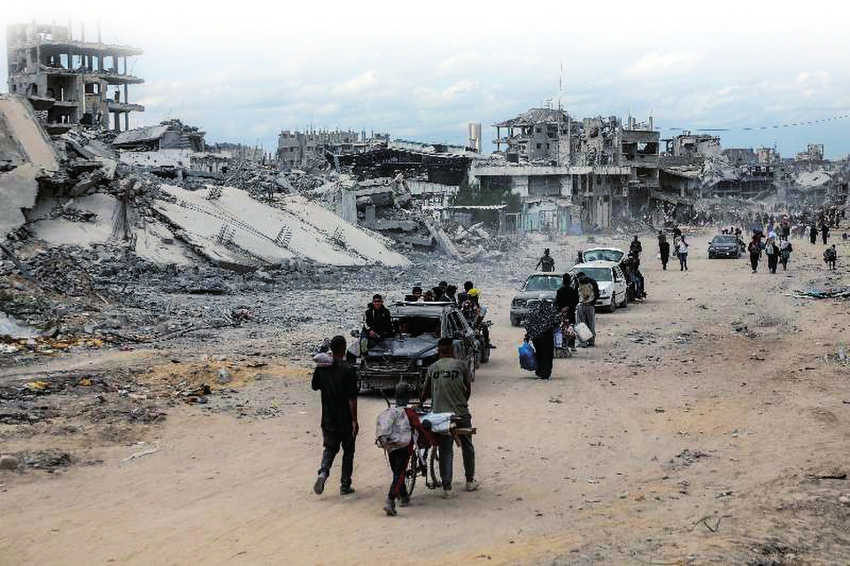 10月12日,在加沙地带南部汗尤尼斯,重返家园的巴勒斯坦人走过严重受损的建筑。 新华社发