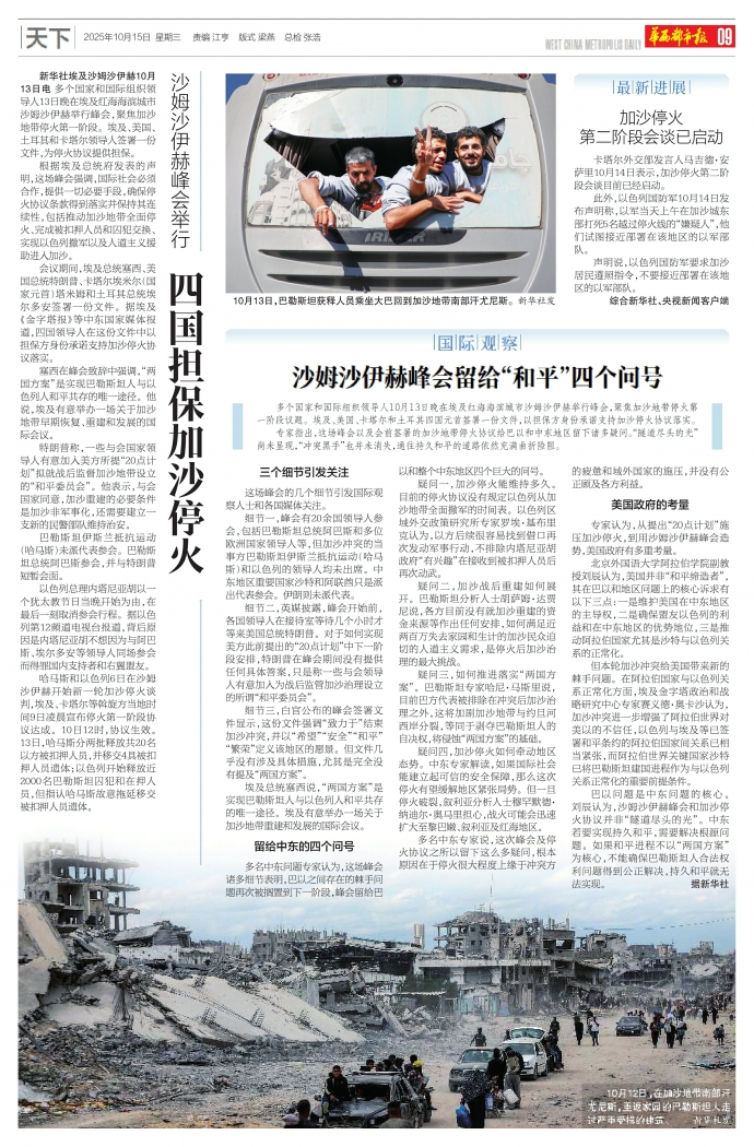 特朗普称,一些与会国家领导人有意加入美方所提“20点计划”拟就战后监督加沙地带设立的“和平委员会”。他表示,与会国家同意,加沙重建的必要条件是加沙非军事化,还需要建立一支新的民警部队维持治安。