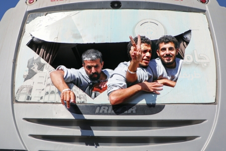 10月13日,巴勒斯坦获释人员乘坐大巴回到加沙地带南部汗尤尼斯。新华社发