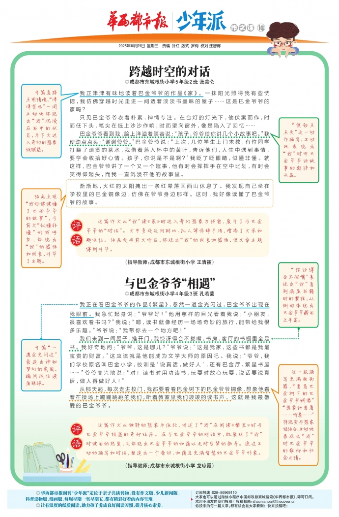 这篇作文以“我”读《家》时进入奇幻想象为线索,展开了与巴金爷爷的“对话”。文中多处运用排比、拟人等修辞手法,增添了文采和趣味性。结尾处与前文呼应,体现出“我”的成长和感悟,使文章主题得到升华。