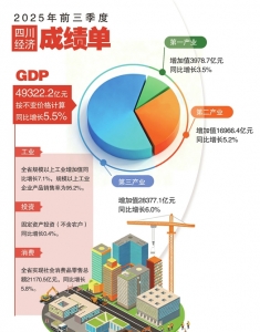 10月21日,四川省统计局发布2025年前三季度四川经济“成绩单”。数据显示,前三季度,全省实现地区生产总值49322.2亿元,按不变价格计算,同比增长5.5%。如何评价前三季度四川经济运行总体表现?这些重要数据的背后透出了哪些新信号?省统计局相关负责人从三方面进行了解读。