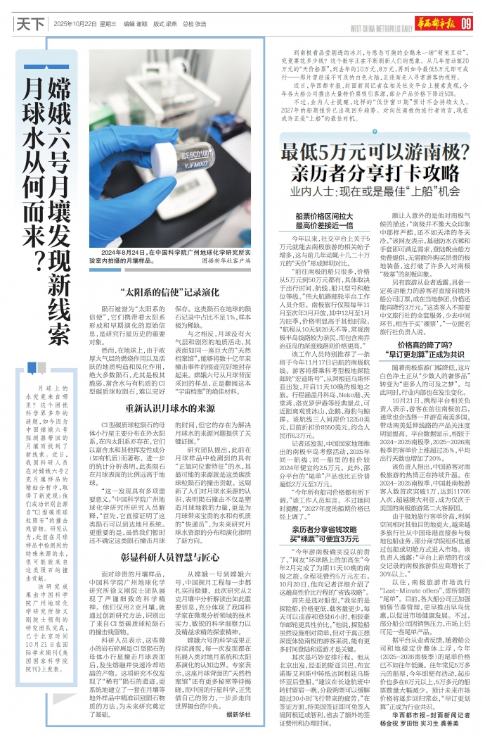 月球上的水究竟来自哪里?这个困扰科学界多年的谜题,如今因为中国嫦娥六号探测器带回的月壤而找到了新线索。近日,我国科研人员在对嫦娥六号2克月壤样品的精细分析中,取得了新发现:他们成功识别出源自“CI型碳质球粒陨石”的撞击残留物。研究认为,此前在月球样品中检测到的特殊来源的水,很可能就来自这类陨石的撞击贡献。