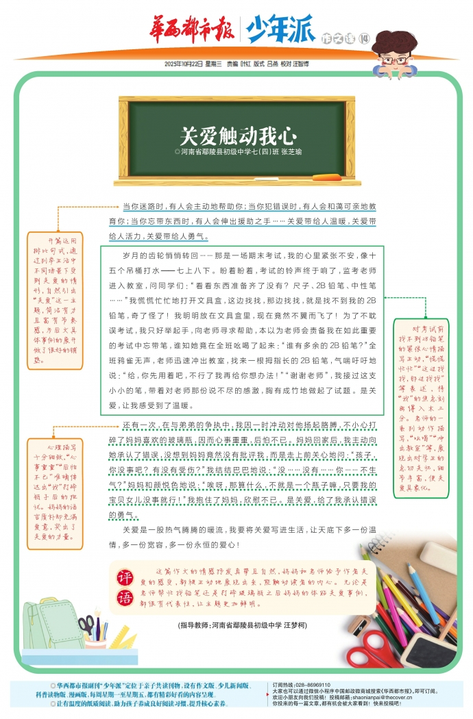 岁月的齿轮悄悄转回……那是一场期末考试,我的心里紧张不安,像十五个吊桶打水——七上八下。盼着盼着,考试的铃声终于响了,监考老师进入教室,问同学们:“看看东西准备齐了没有?尺子、2B 铅笔、中性笔……”我慌慌忙忙地打开文具盒,这边找找,那边找找,就是找不到我的 2B铅笔,奇了怪了!我明明放在文具盒里,现在竟然不翼而飞了!为了不耽误考试,我只好举起手,向老师寻求帮助,本以为老师会责备我在如此重要的考试中忘带笔,谁知她竟在全班吆喝了起来:“谁有多余的 2B 铅笔?”全班鸦雀无声,老师迅速冲出教室,找来一根拇指长的 2B 铅笔,气喘吁吁地说:“给,你先用着吧,不行了我再给你想办法!”“谢谢老师”,我接过这支小小的笔,带着对老师那份说不尽的感激,胸有成竹地做起了试题。是关爱,让我感受到了温暖。