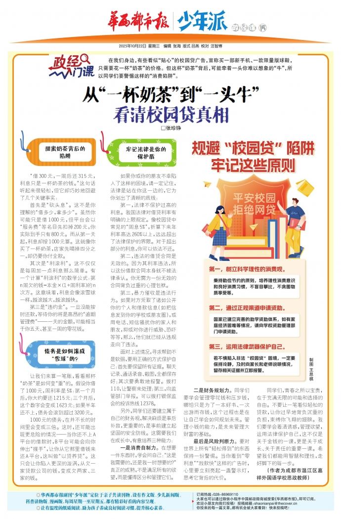 在我们身边,有些看似“贴心”的校园贷广告,宣称买一部新手机、一款限量版球鞋,只需要花一杯“奶茶”的价格。但这杯“奶茶”背后,可能牵着一头你难以想象的“牛”,所以同学们要警惕这样的“消费陷阱”。