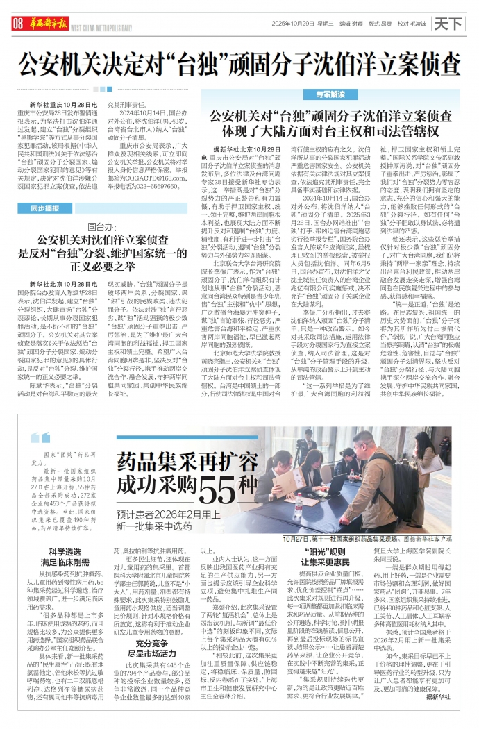 新华社北京10月28日电国务院台办发言人陈斌华28日表示,沈伯洋发起、建立“台独”分裂组织,大肆宣扬“台独”分裂谬论,长期从事分裂国家犯罪活动,是不折不扣的“台独”顽固分子。公安机关对其立案侦查是落实《关于依法惩治“台独”顽固分子分裂国家、煽动分裂国家犯罪的意见》的具体行动,是反对“台独”分裂、维护国家统一的正义必要之举。