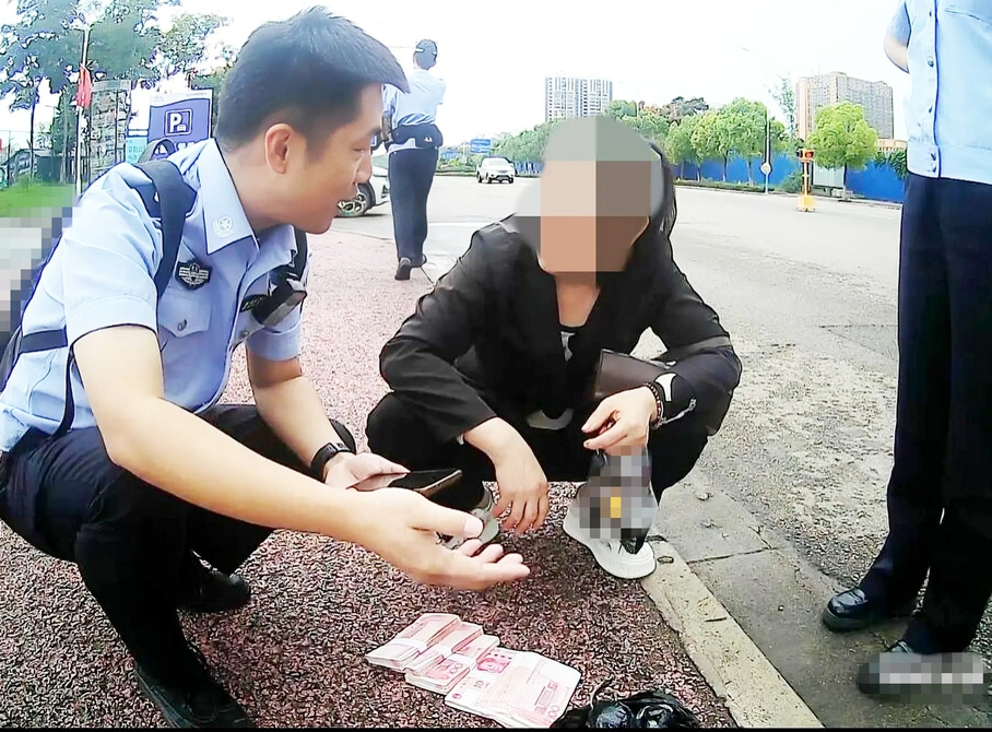 警方在高速路口迎接王女士,现场清点现金。资阳雁江警方供图