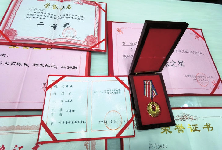 苟俊获得的部分荣誉证书和军功章。