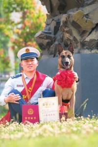 “三丰”获得“二级功勋犬”称号后,训导员王坤与它的合照。