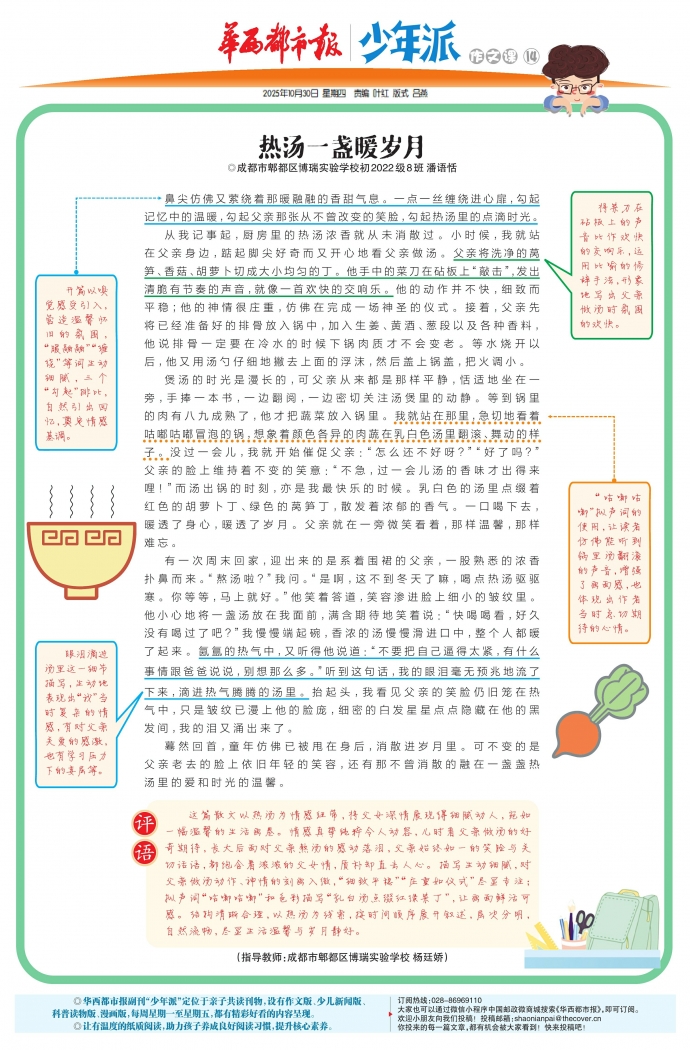这篇散文以热汤为情感纽带,将父女深情展现得细腻动人,宛如一幅温馨的生活画卷。情感真挚纯粹令人动容,儿时看父亲做汤的好奇期待,长大后面对父亲熬汤的感动落泪,父亲始终如一的笑脸与关切话语,都饱含着浓浓的父女情,质朴却直击人心。描写生动细腻,对父亲做汤动作、神情的刻画入微,“细致平稳”“庄重如仪式”尽显专注;拟声词“咕嘟咕嘟”和色彩描写“乳白汤点缀红绿菜丁”,让画面鲜活可感。结构清晰合理,以热汤为线索,按时间顺序展开叙述,层次分明,自然流畅,尽显生活温馨与岁月静好。