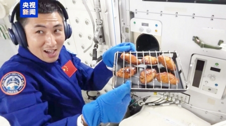 在中国空间站,航天员武飞端出一盘滋滋冒油的烤鸡翅。央视视频截图