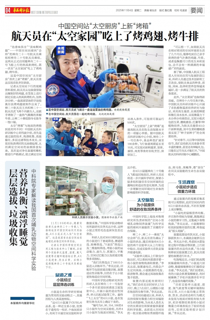 11月1日6时45分,随着实验单元由神舟二十一号载人飞船转运至中国空间站问天实验舱,4只小鼠正式入住“太空家园”。这是我国首次在空间站实施哺乳动物空间科学实验。