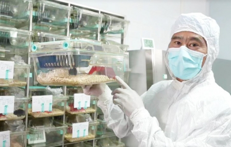 科研人员展示实验小鼠。图据新华社客户端