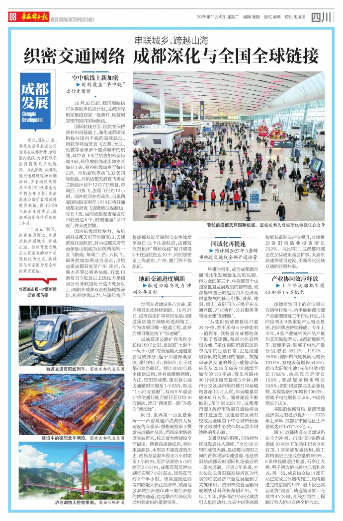 近日,国航、川航、春秋航空等航空公司密集在成都新开、加密国内航线,为市民秋冬出行提供更多元选择。与此同时,成都轨道交通建设现场热潮涌动,多条地铁线路及市域(郊)铁路全力冲刺全年目标;成渝高速公路扩容项目进度再刷新,预计2028年底全线建成后,成渝两地车程将再缩短1小时。