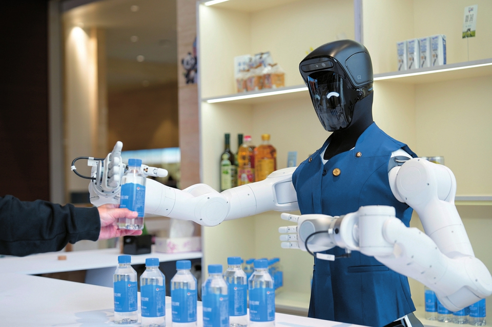 11月4日,机器人服务员在第八届进博会新闻中心为工作人员递瓶装水。