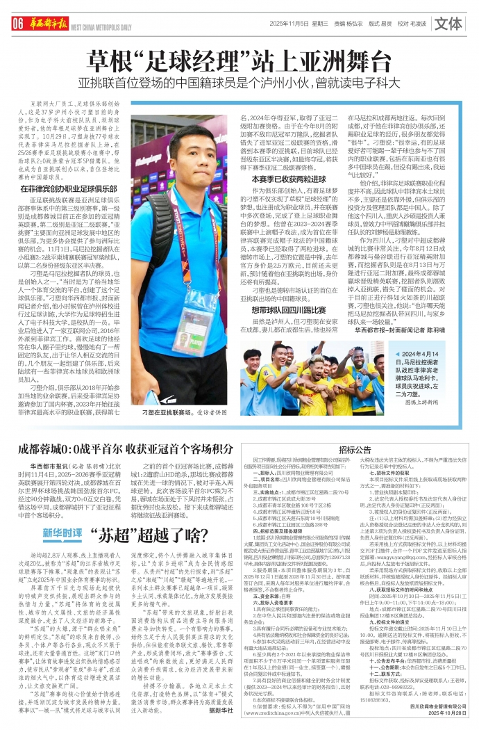 互联网大厂员工、足球俱乐部创始人,这是37岁泸州小伙刁塑目前的身份,作为电子科大前校队队员、坝坝球爱好者,他的草根足球梦在亚洲舞台上实现了。10月29日,刁塑身披77号球衣代表菲律宾马尼拉挖掘者队上场,在25/26赛季亚足联挑战联赛小组赛中,帮助球队2:0战胜蒙古冠军SP猎鹰队。他也成为自亚挑联创办以来,首位登场比赛的中国籍球员。