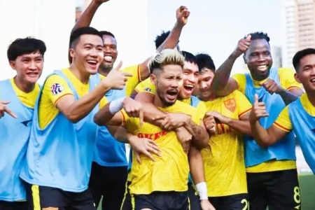 2024年4月14日,马尼拉挖掘者队战胜菲律宾老牌球队马哈利卡,球员庆祝进球,左二为刁塑。