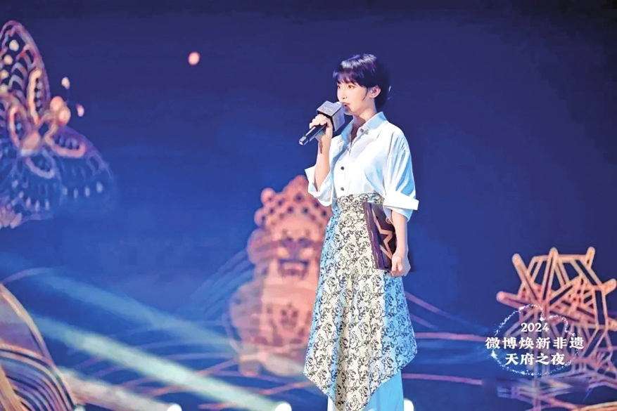 李子柒身着一袭熊猫蜀锦长裙亮相。图据焕新非遗·天府之夜