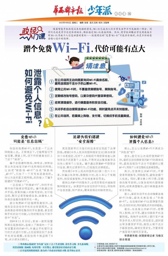 随着智能手机和笔记本电脑的普及,Wi-Fi已成为人们日常生活中不可或缺的一部分。同学们无论是学习还是休闲娱乐,都会通过Wi-Fi连接网络。然而,有学校却曝出学生因连接不明Wi-Fi导致个人信息泄露的案例……校园周边的“免费Wi-Fi”可能并非福利,而是不怀好意者精心设计的陷阱。