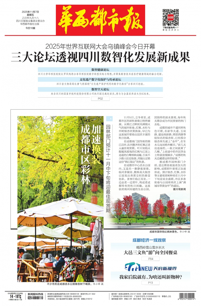 据成都市园林部门介绍,受近期昼夜温差加大的影响,成都彩叶景观正加速形成。预计银杏、红枫、水杉等主要观赏树种将在11月中下旬迎来全盛期,市区多条街巷与公园将再次上演“满城尽带黄金甲”的盛况。