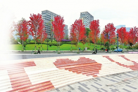 在成都南门国华街的锦江沿岸,队列整齐的红枫正进入最佳观赏期。叶片如焰火般随风摇曳的红枫与江面上追逐的白鹭相映成趣,引来不少路人驻足取景,用镜头定格这份“锦江限定”的秋意。