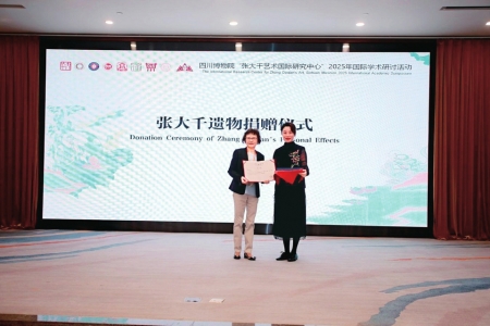 张大千外孙女萧柔嘉(左)向川博捐赠张大千遗物。图据四川博物院