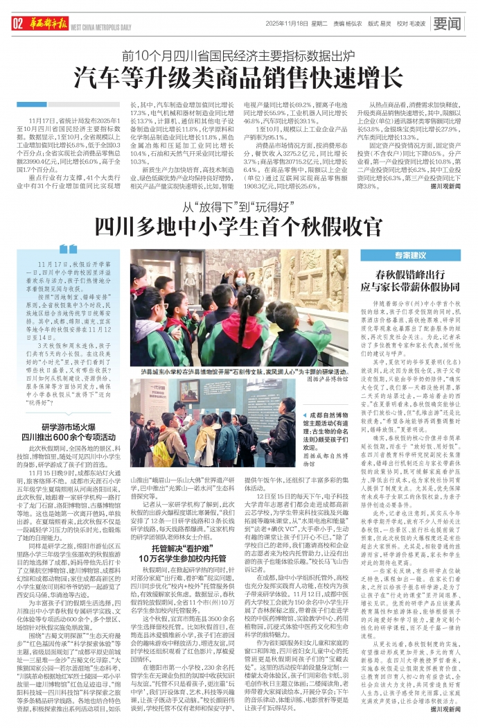 11月17日,省统计局发布2025年1至10月四川省国民经济主要指标数据。数据显示,1至10月,全省规模以上工业增加值同比增长5.8%,低于全国0.3个百分点;全省实现社会消费品零售总额23990.4亿元,同比增长6.0%,高于全国1.7个百分点。