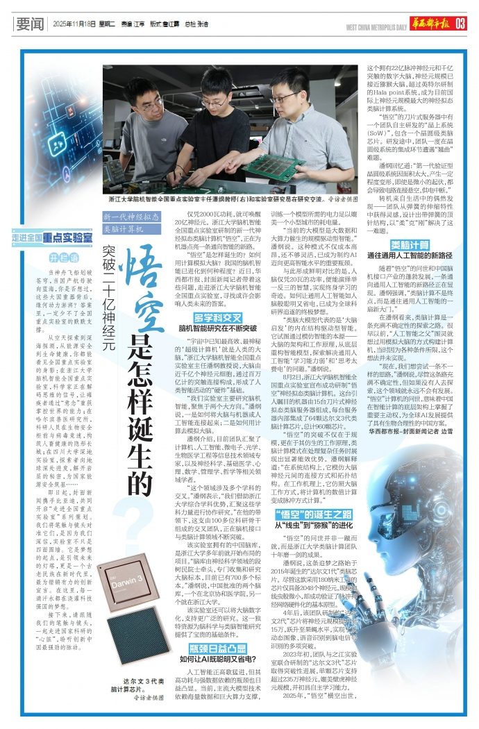 “现在,我们想尝试一条不一样的思路。”潘纲说,尽管这条路充满不确定性,但如果没有人去探索,这个领域就永远不会有发展。“悟空”计算机的问世,意味着中国在智能计算的底层架构上掌握了重要主动权,为全球AI发展提供了具有生物合理性的中国方案。