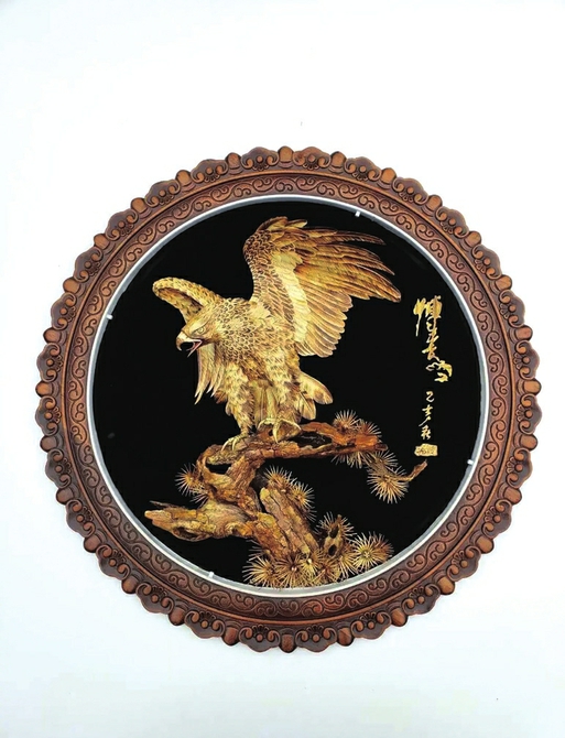 随着技艺演进,麦秆画匠人运用了烫色、剪刻等工艺,让荞麦秆的光泽在深色底面上熠熠生辉,动物与山水栩栩如生。如今,荞麦秆画更突破“画”的形式,制作成团扇、摆件,焕发出现代生机,吸引了海内外观众的目光。