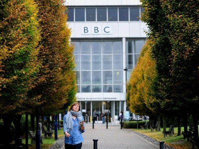 2010年11月5日,在英国首都伦敦,一名女子离开英国广播公司(BBC)电视中心。图据新华社客户端
