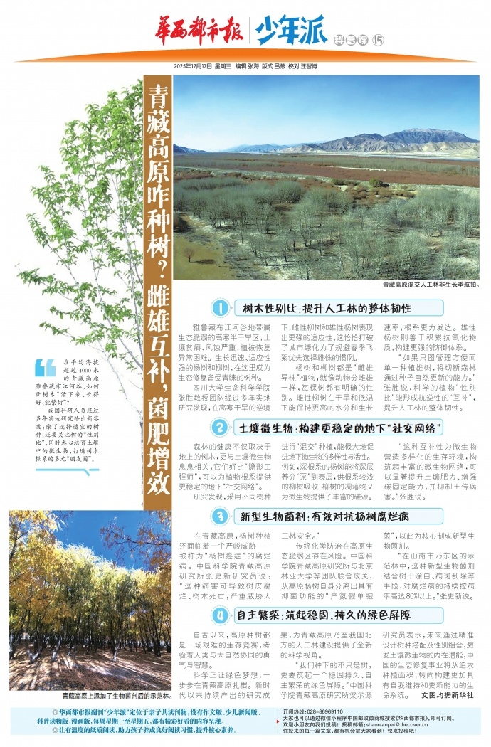 “我们种下的不只是树,更要筑起一个稳固持久、自主繁荣的绿色屏障。”中国科学院青藏高原研究所梁尔源研究员表示,未来通过精准设计树种搭配及性别组合,激发土壤微生物的内在潜能,中国的生态修复事业将从追求种植面积,转向构建更加具有自我维持和更新能力的生命系统。 文图均据新华社
