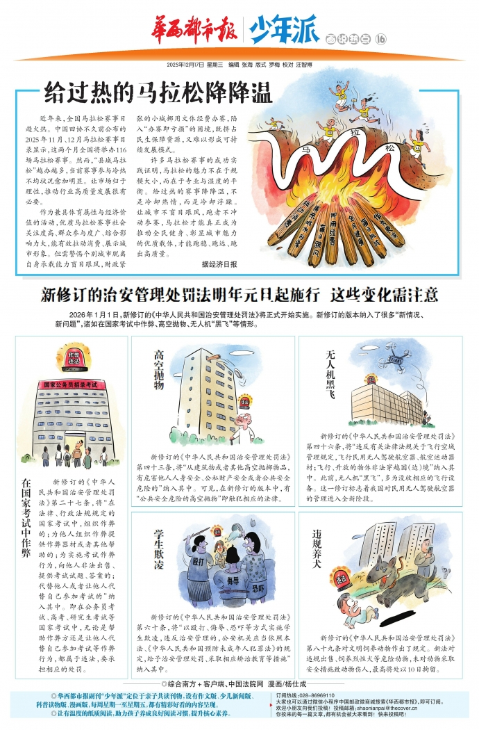 2026年1月1日,新修订的《中华人民共和国治安管理处罚法》将正式开始实施。新修订的版本纳入了很多“新情况、新问题”,诸如在国家考试中作弊、高空抛物、无人机“黑飞”等情形。