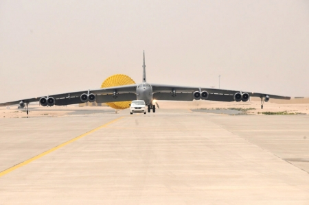 这张拍摄于2016年4月9日的照片显示,一架美国空军的B-52轰炸机抵达卡塔尔乌代德空军基地。图据新华社客户端