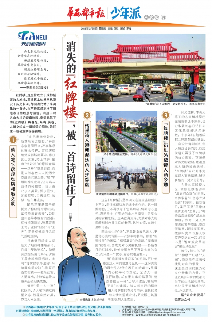 如今,诗中的“新莺”“柳绿”“红楼”“人潮”,依然能在红牌楼找到对应的景象——这正是诗词的魅力和文化传承的力量。它让200多年前的成都与当下的生活遥相共鸣,也让关于红牌楼的记忆,永远鲜活。