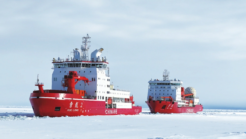 “雪龙2”号(前)在为“雪龙”号破冰引航。