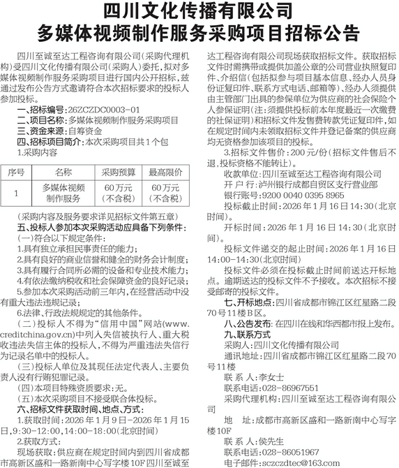 四川文化传播有限公司多媒体视频制作服务采购项目招标公告
