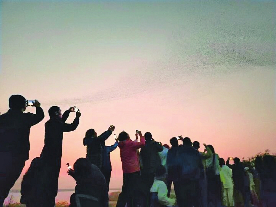 游客在黄河口拍摄“鸟浪”奇观。图据新华社客户端