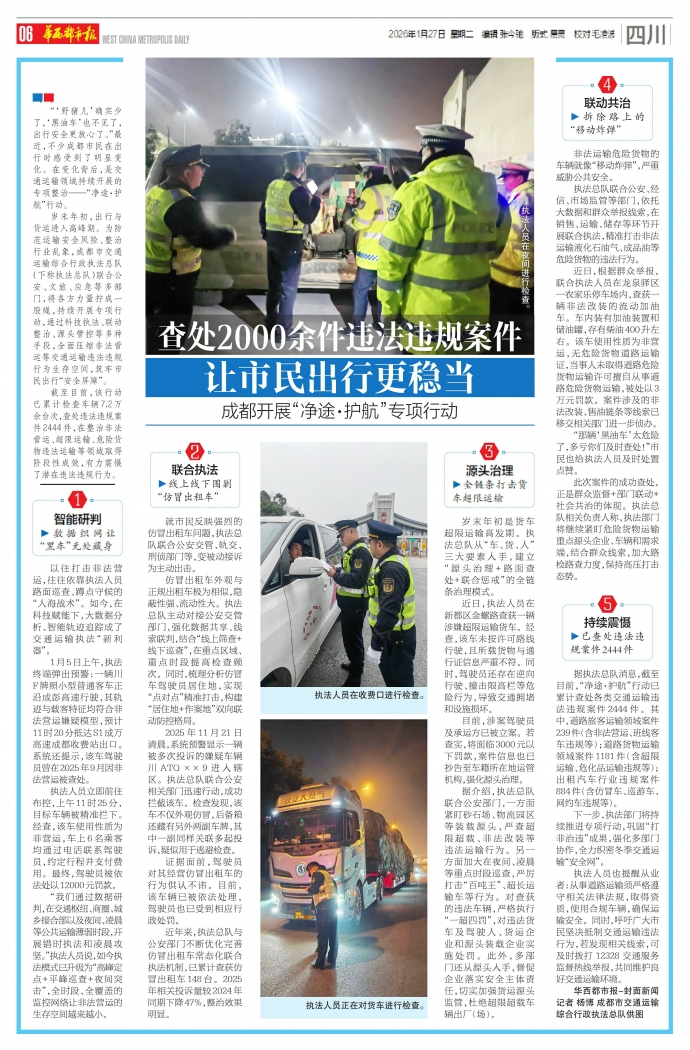 “‘野猪儿’确实少了,‘黑油车’也不见了,出行安全更放心了。”最近,不少成都市民在出行时感受到了明显变化。在变化背后,是交通运输领域持续开展的专项整治——“净途·护航”行动。